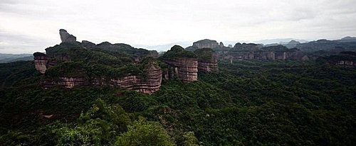 從市區進入丹霞山地界,一座座平地拔起獨立的山頭,連綿成天際線,讓人開始期待即將見到的景象。搭乘纜車直上長老峰,從遼闊的觀景平台,便能盡覽風景區的全貌,只見被大自然風化雕塑的山峰綿延起伏、陡峭的山壁上草木不生,紅石上展現嶙峋的線條,山頭上則覆蓋著堅強的綠色植物,絲毫不讓桂林山水專美於前。